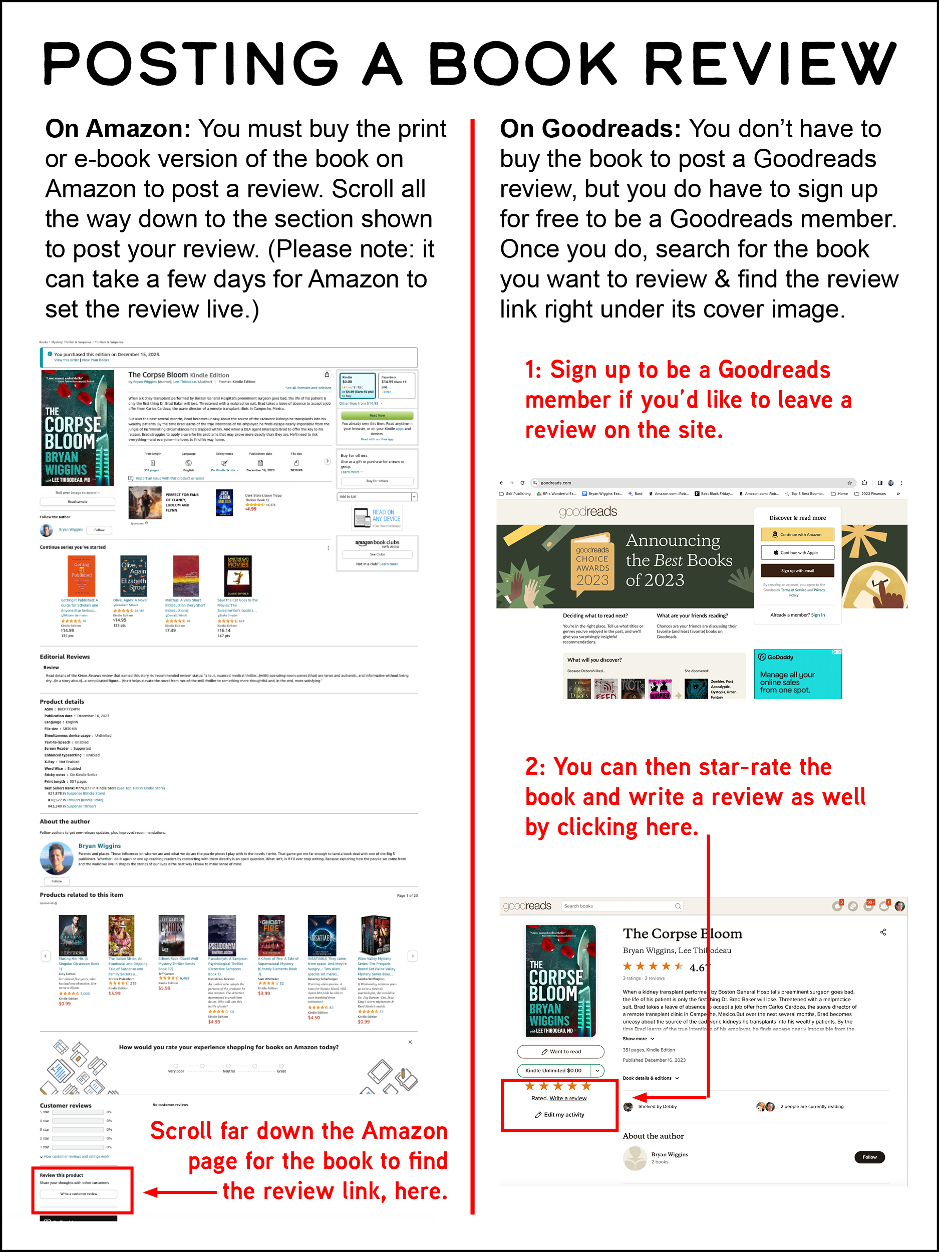 Start the New Year with a bang by downloading your free digital copy of The Corpse Bloom any time between January 1st and 5th, 2024. You can read this e-book version on any smart phone, tablet, or computer with the Kindle reading app for PC or Mac that you can download here for free. If you purchased the paperback edition of the book at The Corpse Bloom launch party or received it as a gift, downloading the e-book will log you as an authorized reviewer of the book on Amazon, allowing you to post a review of the book on the site. Whether you’ve read the print book or are reading the e-book for the first time, a posted review on Amazon and Goodreads will be greatly appreciated. See below for how to post a review, and thank you!